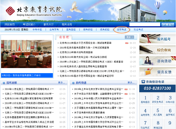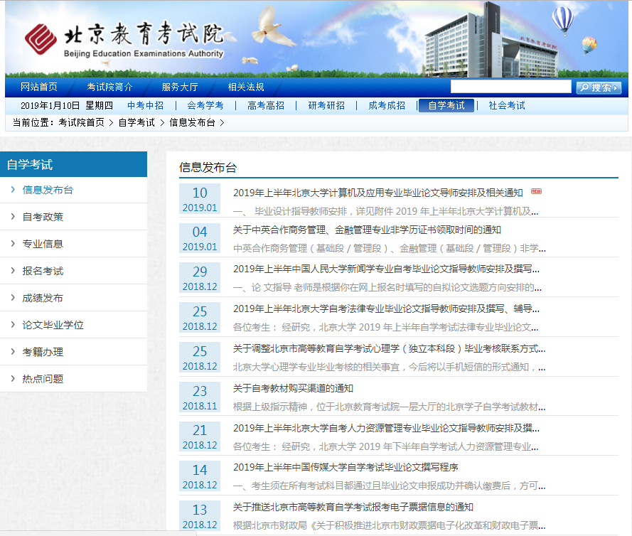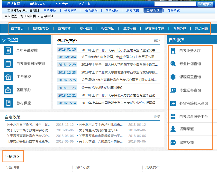 图1:北京教育考试院网站首页 点击考试院网站首页上的“自学考试”,可进入自考栏目(如图2)。点击页面上方的链接(信息台发布、自考政策、专业信息、报名考试、成绩发布等)可查看相应分类信息(如图3)。如果不清楚信息所属的类别,找不到自己想要的信息,可以通过页面右上角的搜索框进行搜索。 页面右侧列出了自考业务大厅、专业计划查询、课程设置查询、毕业证书查询、外省考籍转入查询、自考综合服务平台、留言反馈等相关系统的链接。 页面下方是问题咨询版块,内容包括专业信息、报名考试、成绩发布、论文毕业学位、考籍办理等自考各个环节的相关信息及问题解答。