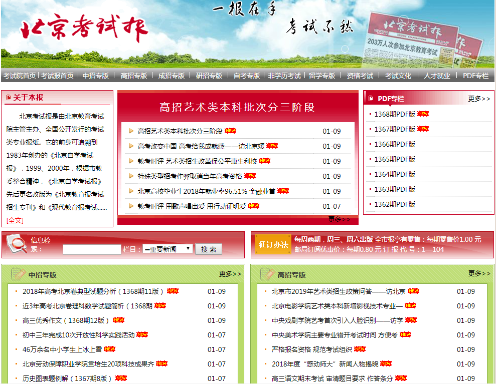 图3:北京教育考试院网站-自考栏目-分类信息 北京考试报是由北京教育考试院主管主办、全国公开发行的考试类专业报纸。它的前身可追溯到1983年创办的《北京自学考试报》,1999、2000年,根据市教委整合精神,《北京自学考试报》先后更名改版为《北京教育报考试招生专刊》和《现代教育报考试招生专刊》。2004年4月11日,经国家新闻出版总署和北京市新闻出版局批准,北京教育考试院重新取得独立报刊号,正式创刊北京考试报。 北京考试报承袭了宣传自学考试的办报方针,坚持权威、及时、全面、系统发布自学考试各项政策信息,切实起到了自学考试这所没有围墙的大学“教务处”的作用。报纸常年约请主考院校专家、教授撰写文章,专业指导考生自学,常年报道学校办学动态,客观反映自学考试社会助学工作,常年介绍优秀考生事迹,全面反映考生参加自考的甜酸苦辣。“自考发布台”、“自考鸿雁”、“文论漫笔”、“考生自己的故事”、“老兵新传”等已成为报纸的品牌栏目。20年的自考文化传承,20年的品牌效应,随着北京自学考试事业的不断发展壮大,北京考试报也逐渐成为广大自考生和京城数以百计自考助学院校离不开的报纸,是考生的良师益友,是学校的工作指南。 北京考试报网址为http://bjksb.bjeea.cn/ 。