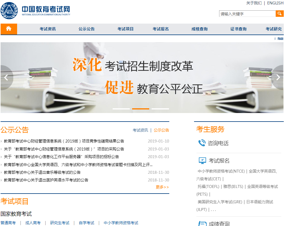 图4:北京考试报网站首页 教育部考试中心为教育部"指定承担教育考试专项职责任务并赋有部分行政管理职能的直属 事业单位"。 1987年,国家教委考试管理中心成立。 1990年,更名为国家教委考试中心。 1994年,国家教委考试中心与国家教委高等教育自学考试办公室(成立于1983年)合并 合并后的机构称"国家教委考试中心"并保留"国家教委自学考试办公室"的牌子。 1998年,国家教委改称教育部,国家教委考试中心相应改称教育部考试中心。 教育部考试中心网址为http://www.neea.edu.cn/ 。